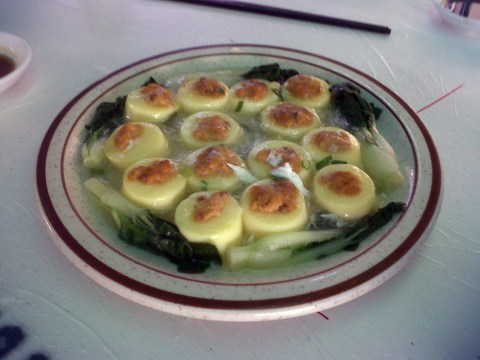 For lunch, each table had a huge platter of shrimp, which I have recently learned to peel with my mouth. Very useful. I overdosed on them as a result of practicing this new skill. We also had these seafoody tofu pudding medallions, which were delightful:
