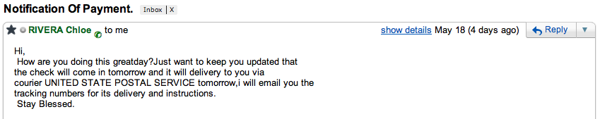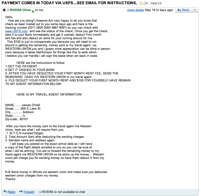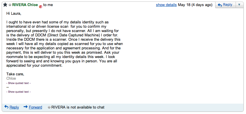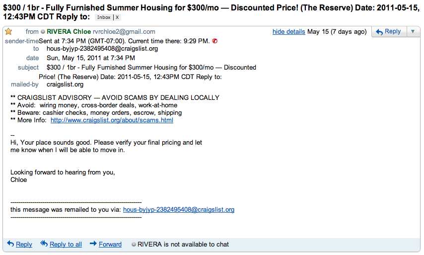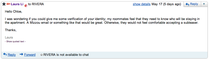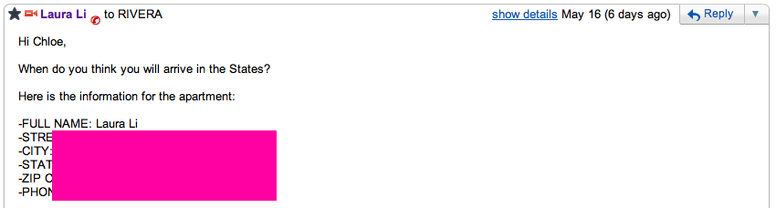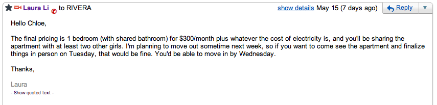Wow! I thought. I must’ve sold the apartment really well on Craigslist because this person just wants to move in with no questions asked! I was cautiously stoked. I also didn’t know what kind of name “RIVERA Chloe” was. But who cares? I replied immediately.
