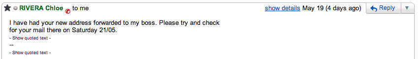 Chloe totally ignored my questions, instead sending me a short email followed by a massive one.