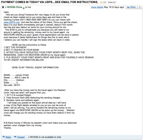Still, curiosity has to end somewhere, and I began to simmer at the thought that someone thought he or she could dupe me so easily. I mean, in the first email sent through Craigslist, it says very prominently, “AVOID SCAMS BY DEALING LOCALLY” and “Avoid: wiring money.” I was foolish enough to believe in this glimmer of hope at first, but not anymore. So I sent a final email.