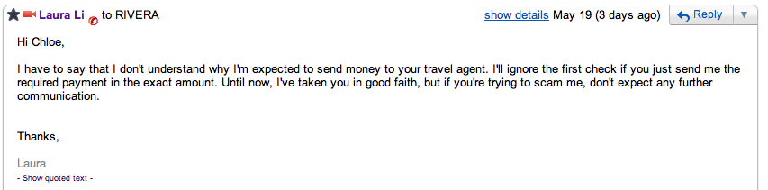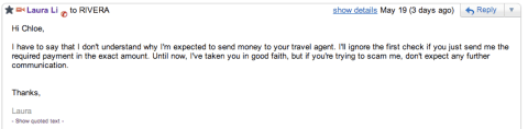 The second one was so clearly a copy/paste job. Unlike the first few emails I received from her, this one didn’t have either my name in the beginning nor hers at the end. And why would her travel agent inexplicably live in Addison, IL? I had half a mind to drive up there myself and punch him in the face. When KW asked me why I bothered communicating with such an obvious scam, I realized that I was simply curious as to where this situation would go.