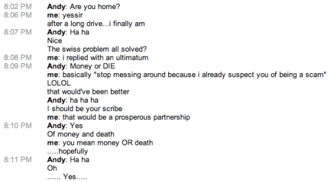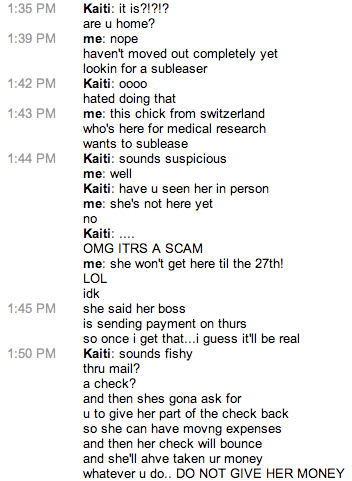 Ahh…so the weird grammar and name must be attributed to her nationality. I read through the email but didn’t really understand the second paragraph, which I shrugged off because SOMEONE FINALLY WANTED MY APARTMENT YAY!! I mean, I was still skeptical of a person moving all the way over here from Switzerland without even asking about roommates, but my optimistic self figured that maybe we were both just desperate enough not to ask too many questions.