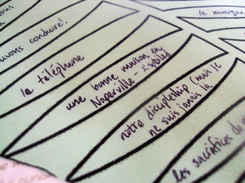 I also unearthed a big leaf printed on a piece of paper [presumably from church/Sunday school] that had a bunch of French written on it in my best friend’s handwriting.
