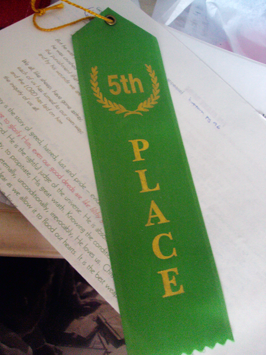 Lastly, I found a ribbon for 5th place. What?! What is the purpose of celebrating or even compensating someone who came in FIFTH place?? This should not even exist! And why did I bother keeping it?!? …………. [I believe it was from something badminton-related. How embarrassing.]