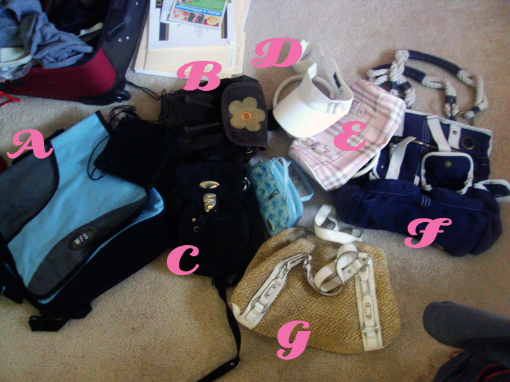 E is a cylindrical purse I got in China when people were crazy over Burberry [and bootlegging the Burberry design]. My mom tried to make me haggle for it myself, but at the age of 14, my haggling skills were even worse than what they are now. We ended up buying it for around 35RMB.