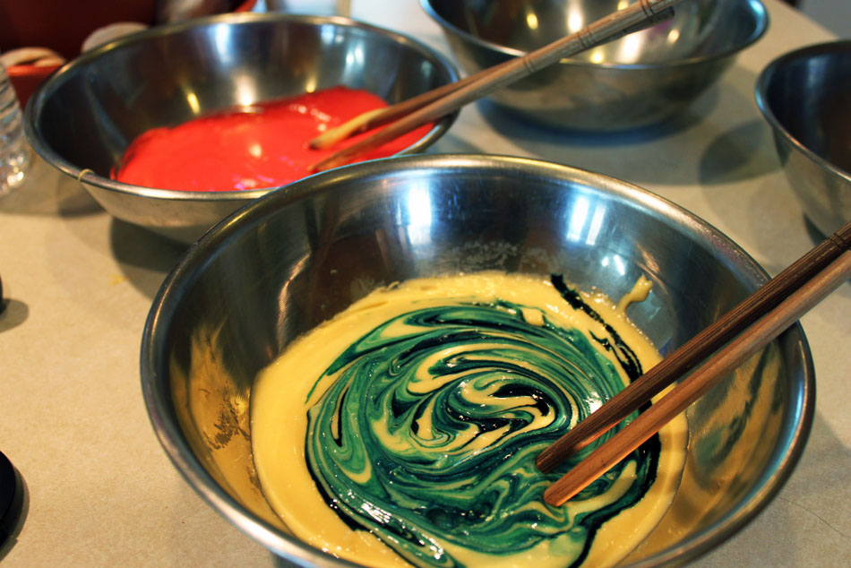 The process started with mixing food coloring into the cake batter. I must’ve used at least 10 bowls with separate chopsticks, spoons and knives for each!