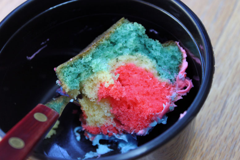 I also made a small batch of non-patriotic rainbow cupcakes, but because there were so few of them, I didn’t dissect one to photograph its insides.