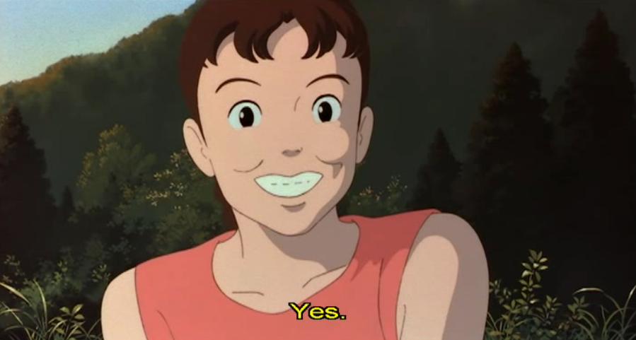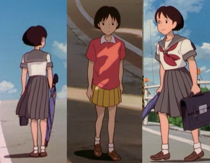 Something about the art style of the film threw me off. Miyazaki characters tend to look pretty similar, but the ones in this movie were slightly different — bigger eyes and none of the dramatic hair-raising. Also, and I don’t know if it’s simply because none of the other characters I’ve seen have worn modern schoolgirl uniforms, but Shizuku’s legs looked severely awkward and disproportionate, which was rare for Miyazaki, who is usually quite precise in his portrayal of the human body and its movements. [I have a thing for legs.]