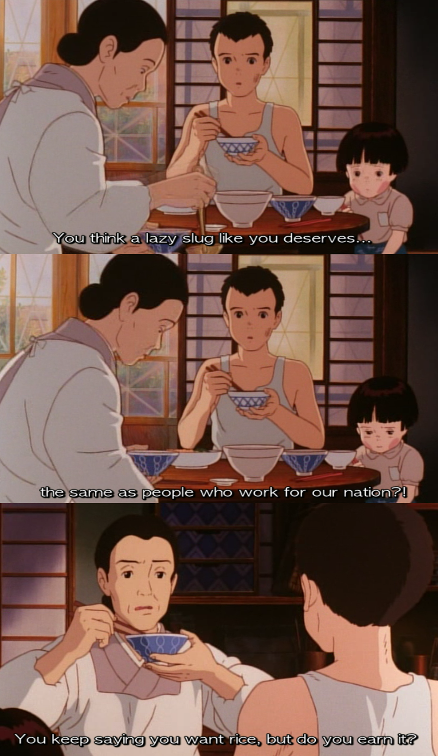 The beginning of this movie doesn’t give much context — a homeless boy is resurrected by a tin of candy, and then we get an apparent flashback to some WWII air raid, during which the mother leaves her teenage son and toddler daughter to fend for themselves at home while she flees to a shelter. Okay…maybe I have to be a Japanese person to truly appreciate this.