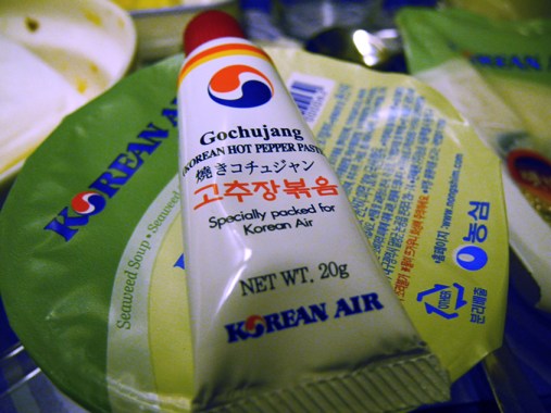 Having flown United for the great majority of my life, I was interested in spotting the differences between the two airlines. For one, Korean Air offers those over-the-ear headphones that people used to use with their Walkmans; I haven’t seen one in forever, and I wondered how many travelers these days would actually neglect to bring their own listening apparatuses. Seeing someone use that style of earphone with a touch-screen device would be so hipster. Each seat also contained a flat package that contained a pair of slippers, earplugs and a toothbrush — how homey!