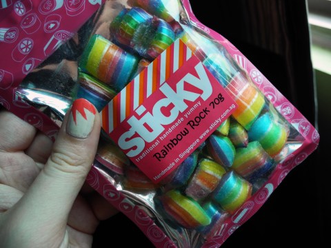 At one of the malls, I spotted a Sticky candy store, which I had read about on Xiaxue, so of course I had to buy some. I only bought a small pack because I didn’t want to carry a whole jar back to Hong Kong, but fortunately, a friend here told me that there’s a Sticky store in HK too! Because I went to Singapore with only a carry-on bag, I tried to limit my purchases and only bought a pair of flats + this candy that day. Here’s a peek at the candy-making process: