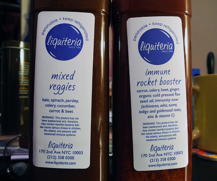 Royal Flush: I was looking forward to a juice like what most people expect juice to taste like, but the prevailing flavor in this one is ginger. Blehh. Still, even a hint of pineapple beats the overpowering taste of celery. Initially I thought the “liver-kidney-lymph detox” ingredient was actually made of liver and kidney, which I just shrugged off — in that episode of Bizarre Food I watched, some Portland mom fed her kids banana smoothies with raw liver mixed in for a boost of iron. I happen to love liver, so… (to be clear, there’s no liver in Liquiteria juices).