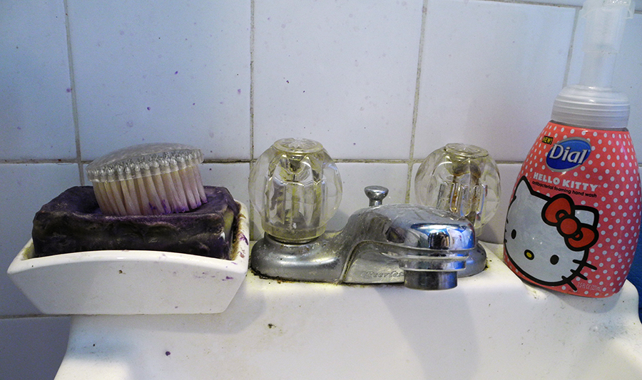 The sink is also home to a bar of soap that’s probably 5 years old. (We use the Hello Kitty liquid soap on the other side.) The sink is already so tiny; why is that fossil taking up precious bathroom real estate?