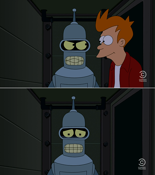 Fry and Bender have stayed the best of buds throughout the years, with the deliveryboy often needing counseling on his love life, and the robot responding harshly but eventually revealing his soft side.