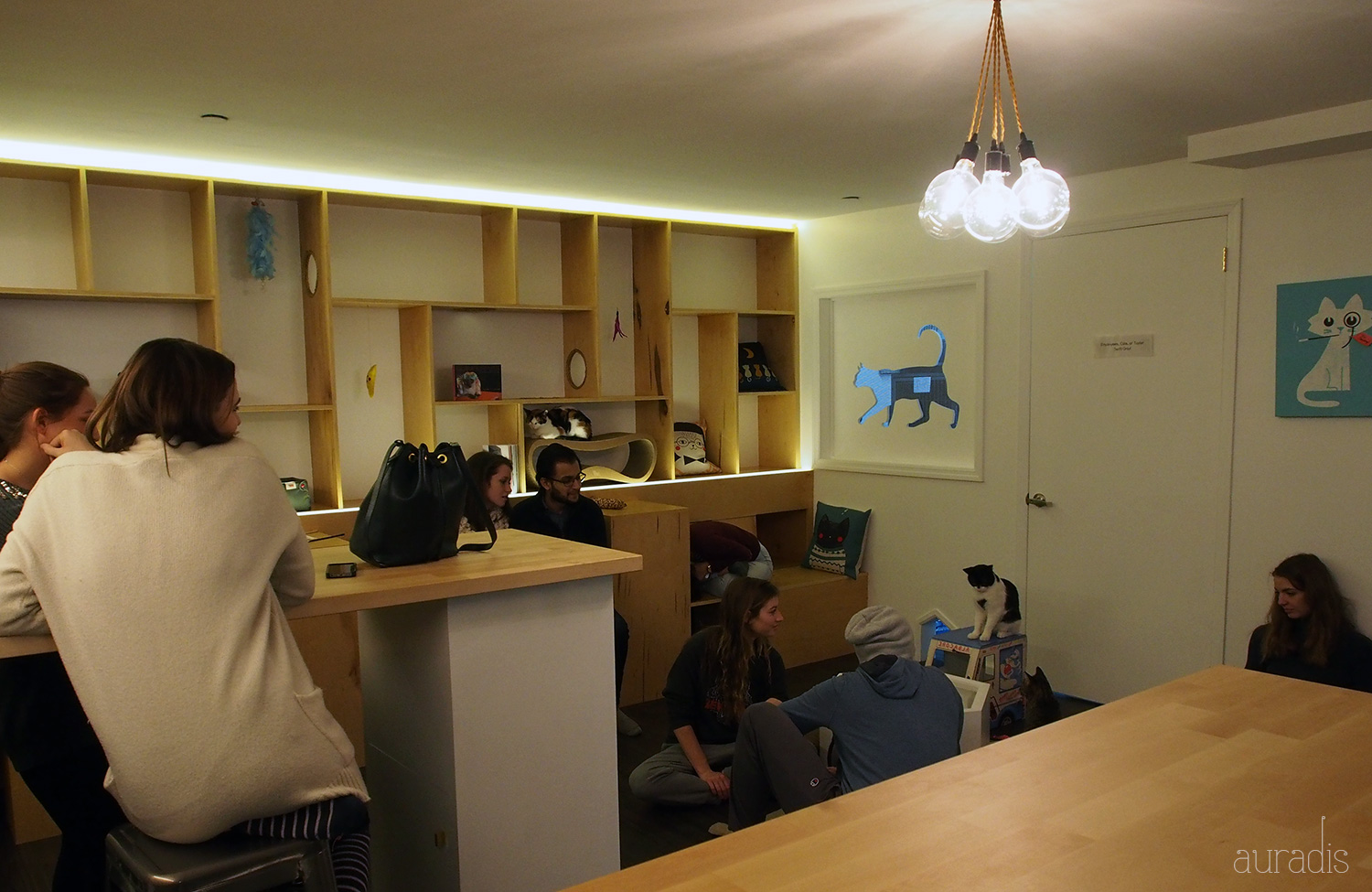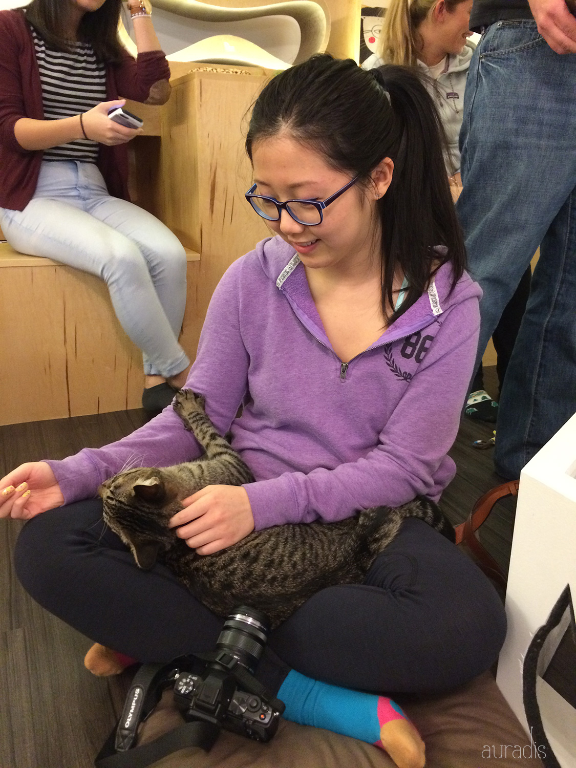 The first time I visited a cat cafe was in Hong Kong (pictures here and here); it was definitely more of a cat-themed cafe that happened to have pet cats — lots of tables and chairs with a full-fledged menu of kitty-shaped things.