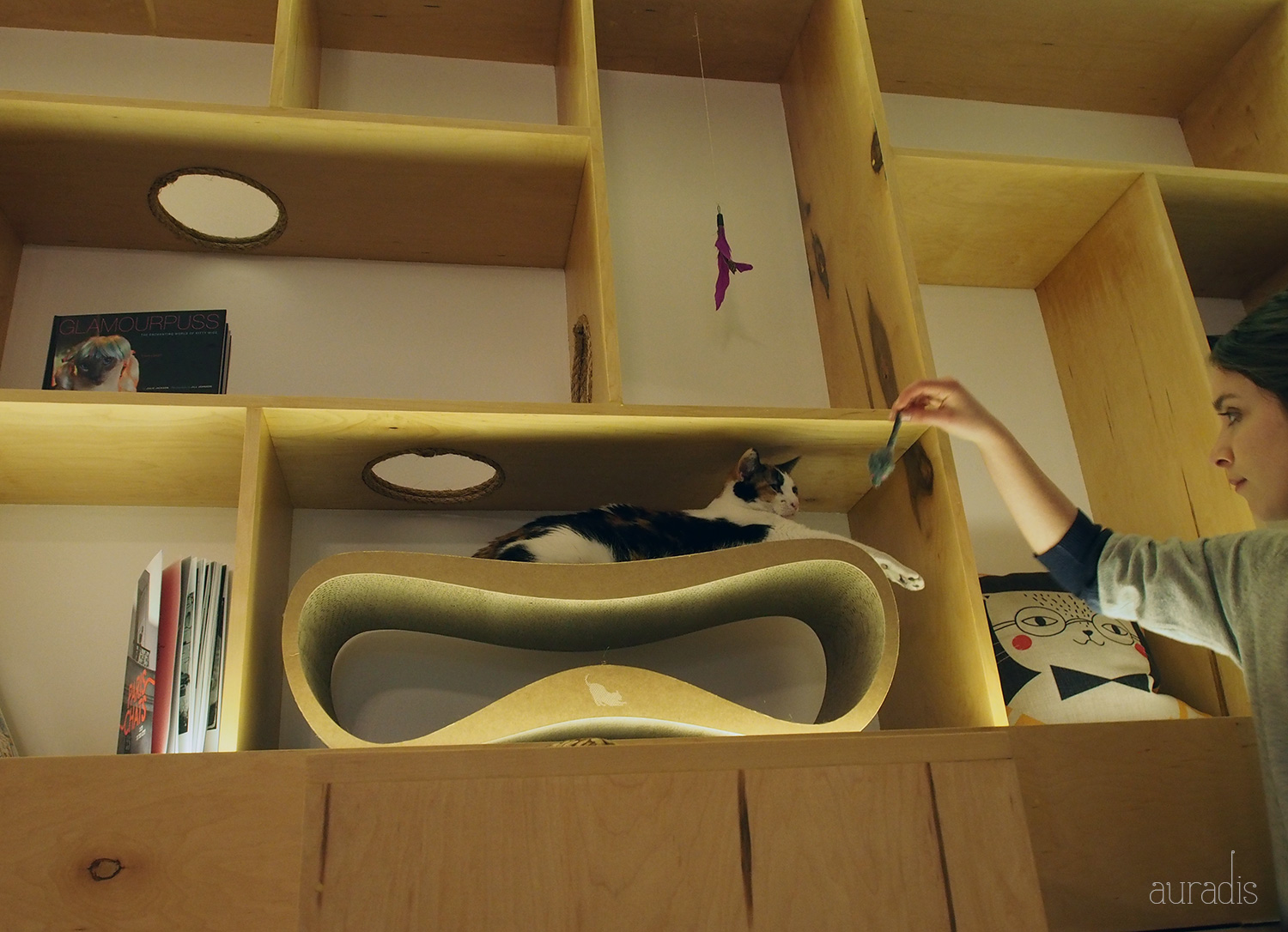I donated to Meow Parlour’s Kickstarter immediately upon learning about it, thus securing myself a reservation for two this past Saturday. When I arrived at 2 p.m., all but two of the kitties were sleeping (I think there were about eight total?), so I chilled and took in all the cat-friendly decor.