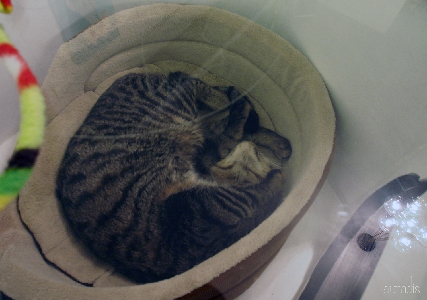 By the time Jennifer arrived and joined me on the floor half an hour later, the kitties started waking up a bit (if only to move to another spot to sleep). Except this one, which was just passed out: