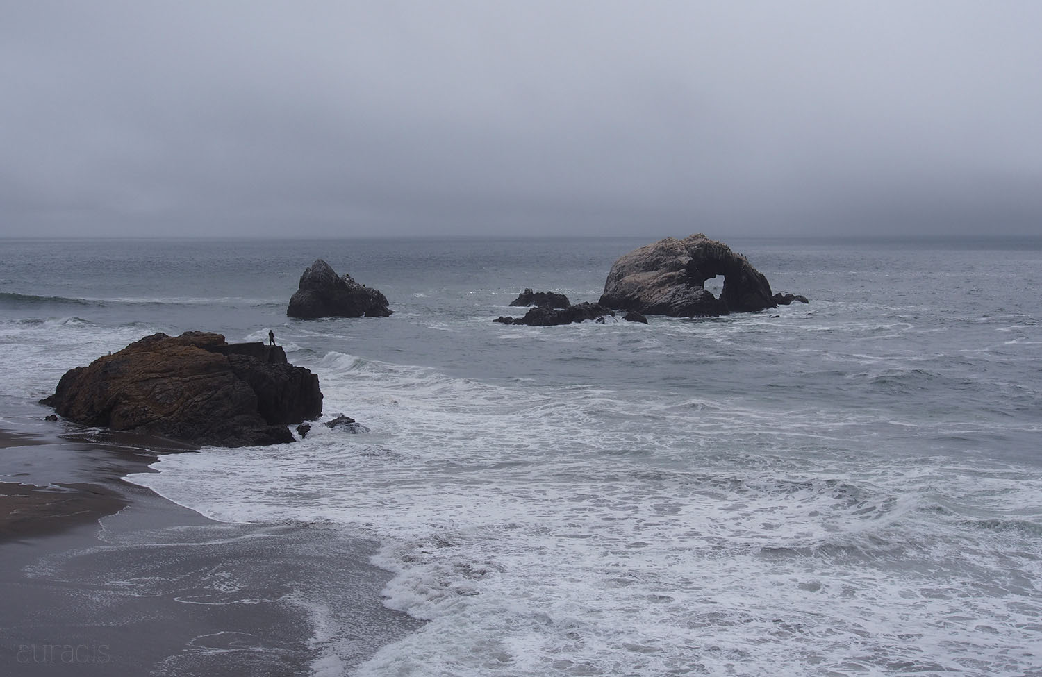 The beach was beautiful, in a melancholy way. We spied a lone fisherman on the rock. (At least, we assumed he was fishing…but how many fish can you catch on the beach like this??)