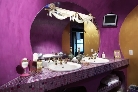Of course, the piéce de rèsistance was the master bathroom. It was difficult to capture comprehensively on camera, but it stretched between the two bedrooms and had curved walls/ceiling with a tiny round skylight as if you were inside an actual genie bottle. Just…HOW?? And the surfaces were covered in the most gorgeous pink sparkly mosaic tile!!!
