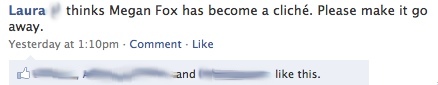 I don’t have anything against Megan Fox. She is a…unique person who says some unusual things, but she has done nothing to make me dislike her. What annoys me is the attitude that she brings out in boys & men [and some women] of all ages, who semi-joke about going to see the Transformers sequel in IMAX just because of her. Okay, she’s a very attractive woman, now get your hand out of your pants and MOVE ON.