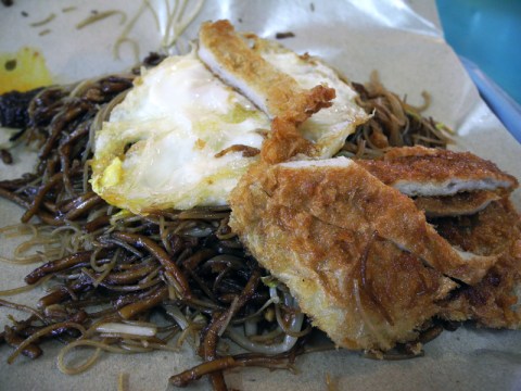The morning after I landed in Singapore, I went out to have breakfast with CK, his parents and his twin brother. It was Good Friday, so the streets were super crowded with parked cars because the churches didn’t have parking lots, despite being mega-church status (apparently). The breakfast location was an open-air food court-type place, which is quite different from the usual IHOP experience but not unlike what you’d find at Chicagoland’s Diho. CK helped me order a plate of noodles, which came with fried fish and egg.