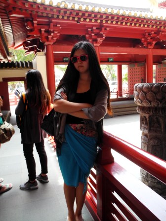 On my second day in Singapore, CK took me to explore Chinatown, for lack of better things to do during the daytime. It seems weird that there is a Chinatown in a predominantly Chinese country, and I really don’t have much of an explanation for that. Our first stop was at a large Buddhist temple, where I was instructed to cover my bare shoulders and short skirt with the (admittedly nice quality) shawls that the temple offered for irreverently skanky people such as myself.